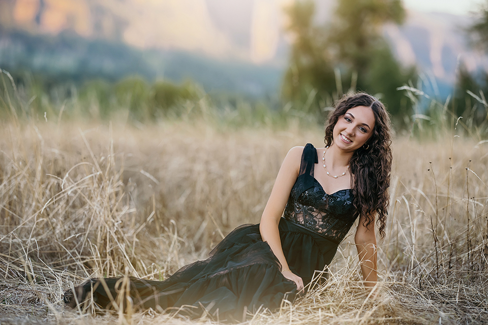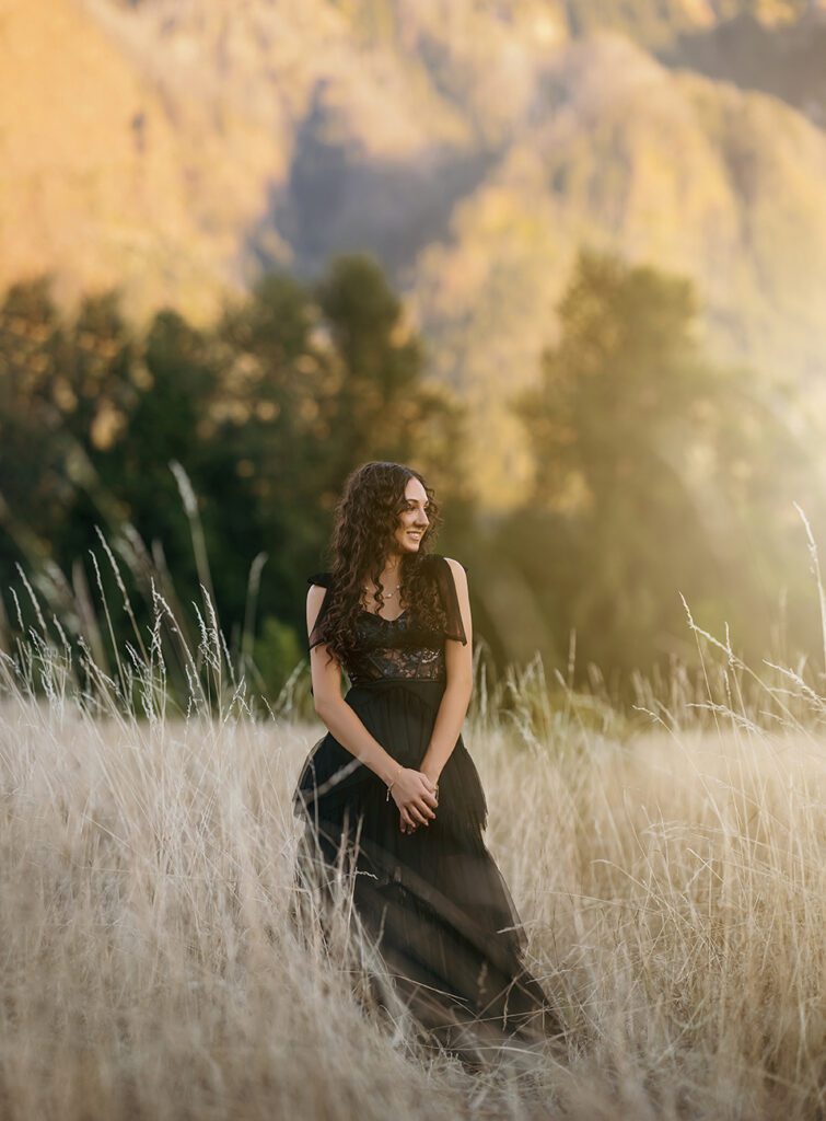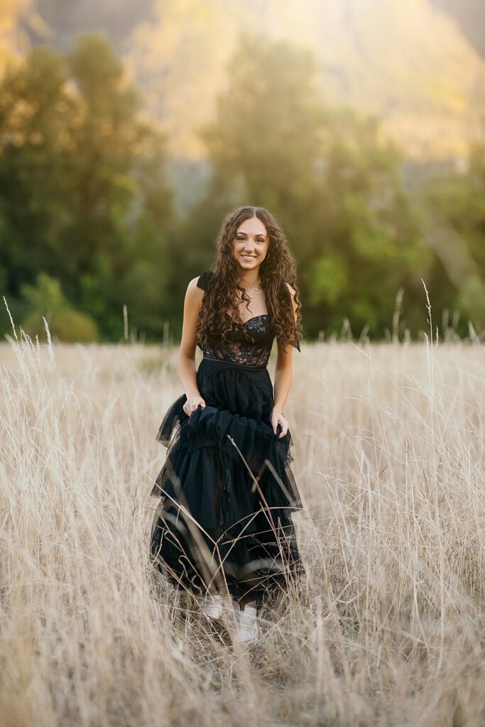 From the moment she stepped into the field in her long black prom dress, it was clear this session was going to be unforgettable. The movement of the fabric against the soft grasses, paired with her long, dark curls, created an effortlessly striking look: classic, graceful, and quietly dramatic.